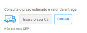 Para consultar o valor e prazo do frete, há possibilidade e consulta prévia por produto, no campo “Consulte o prazo estimado e valor da entrega” localizado logo após as informações iniciais do produto: